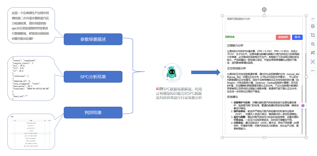 知识图谱辅助决策:系统内置行业知识图谱,自动匹配历史案例库。在啤酒生产场景中,AI调用“PID”关联模型,提供参数调整建议。