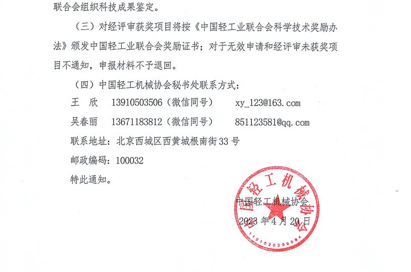 关于组织企业申报2023年度中国轻工业联合会科学技术奖励工作的通知