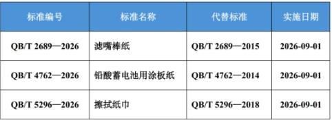 近日,工业和信息化部科技司发布2026年第3号公告,批准发布453项行业标准。其中包括《滤嘴棒纸》等3项造纸领域行业标准,具体信息如下。