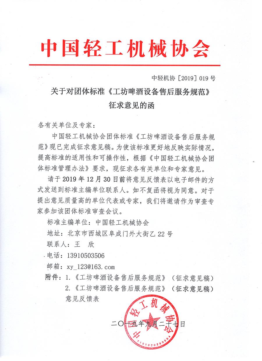 关于对团体标准《工坊啤酒设备售后服务规范》征求意见的函