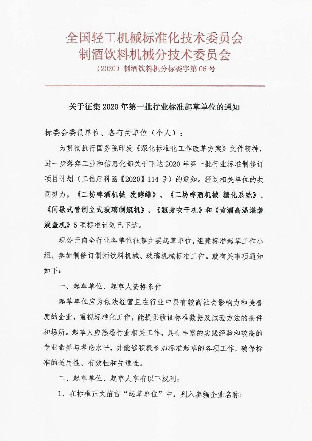 为贯彻执行国务院印发《深化标准化工作改革方案》文件精神,进一步落实工业和信息化部关于下达2020年第一批行业标准制修订项目计划(工信厅科函【2020】114号)的通知。经过相关单位的共同努力,《工坊啤酒机械 发酵罐》、《工坊啤酒机械 糖化系统》、《间歇式管制立式玻璃制瓶机》、《瓶身吹干机》和《黄酒高温灌装旋盖机》5项标准计划已下达。现公开向全行业各单位征集主要起草单位啦!