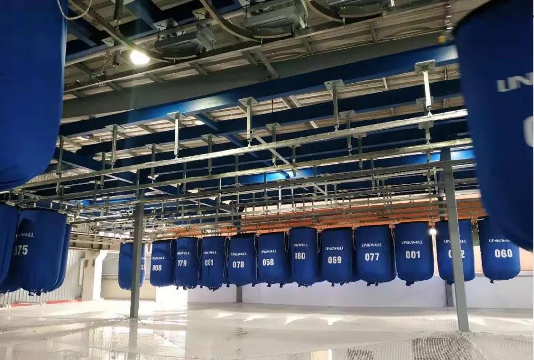 后输送系统包括净吊袋系统和后整理小物流输送。烘干、打散后的净布草传送带自动投料到净吊袋中,通过在空中暂存、接驳、运转,传送至展布机工位处进行展布、烫平、折叠处理,或毛巾折叠机/人工折叠区域。折叠堆码好后的净布草通过折叠机后的物流输送线自动输送到指定点,操作人员根据传送产品的信息进行点数、分类、打包、整理装车出库。