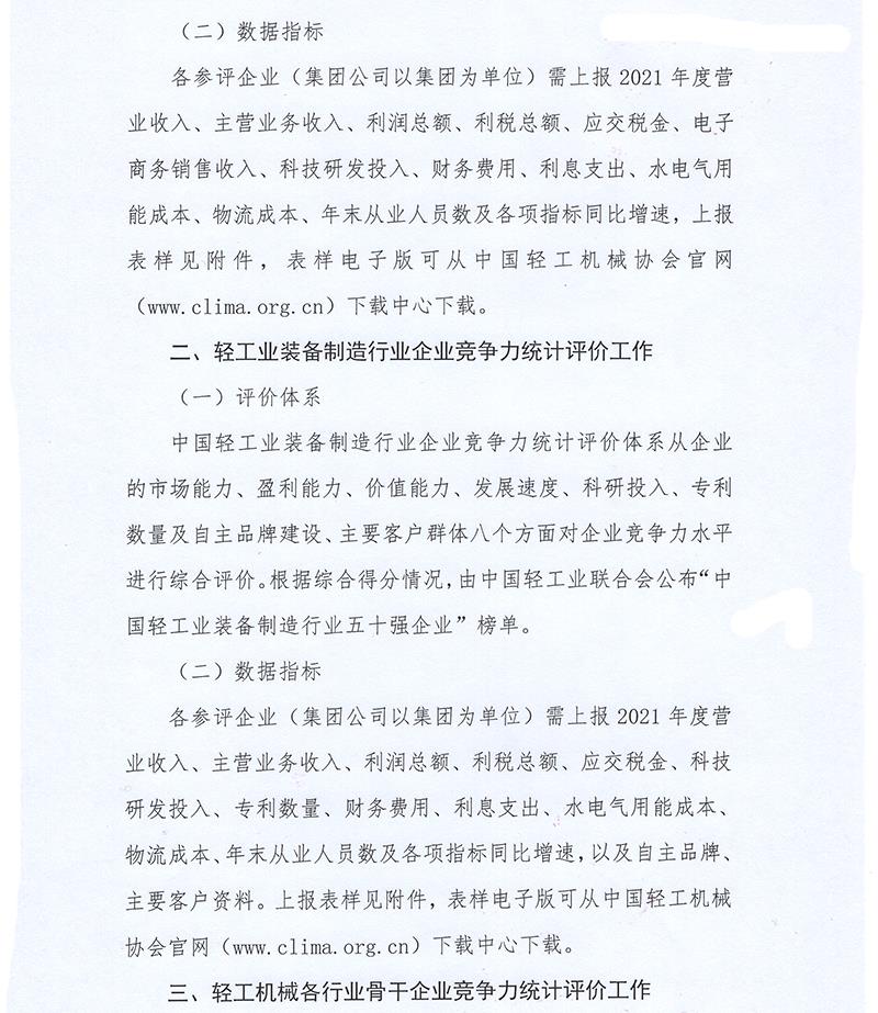关于组织企业申报2021年度中国轻工业企业竞争力等统计评价工作的通知